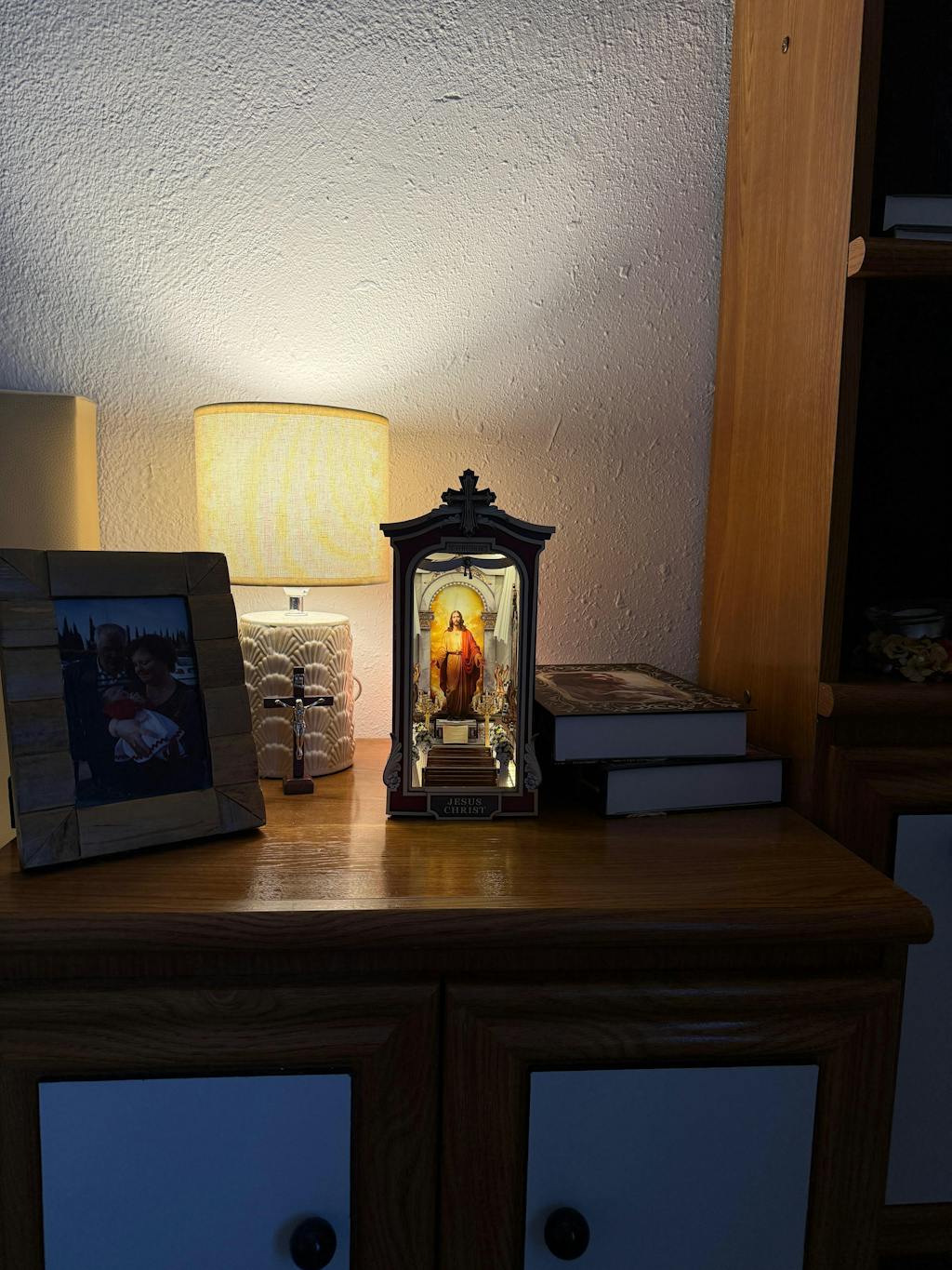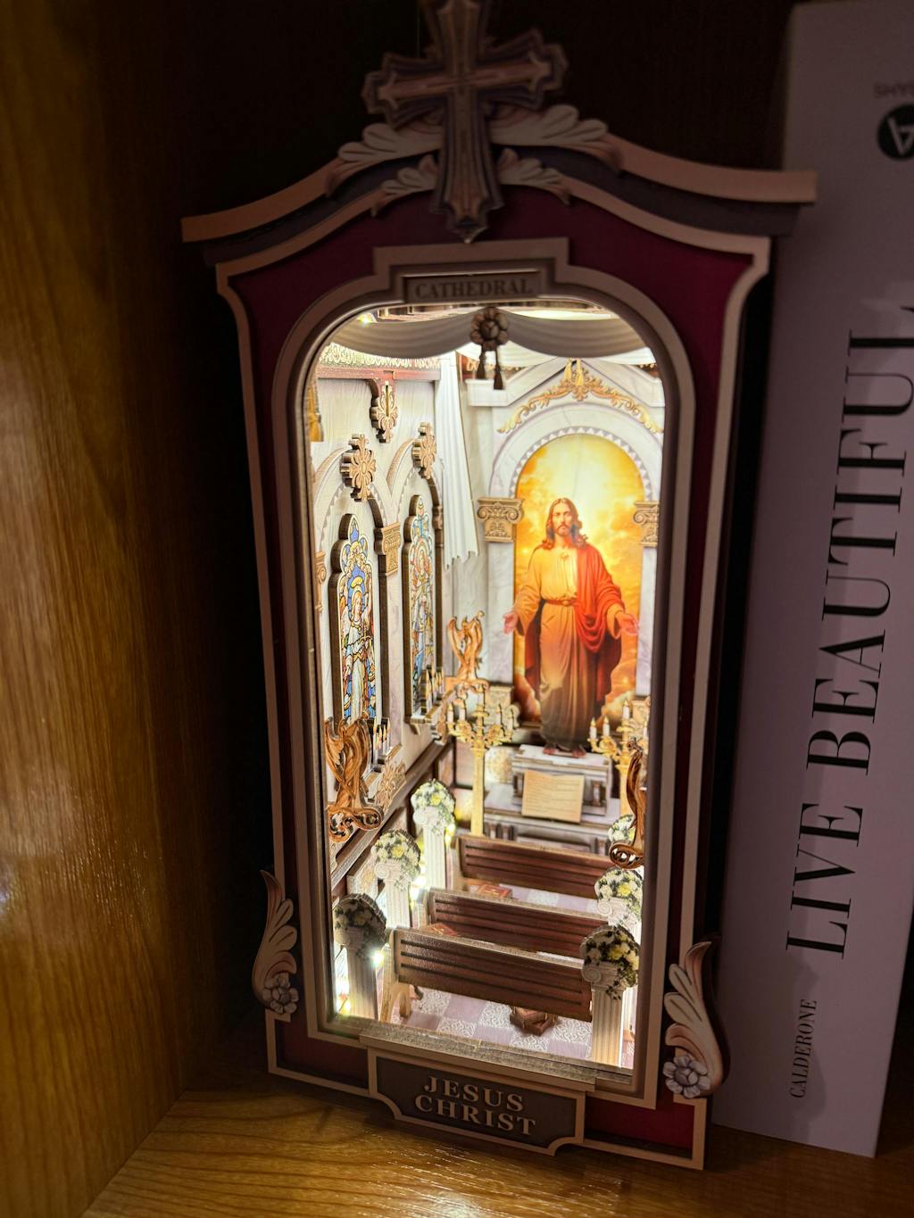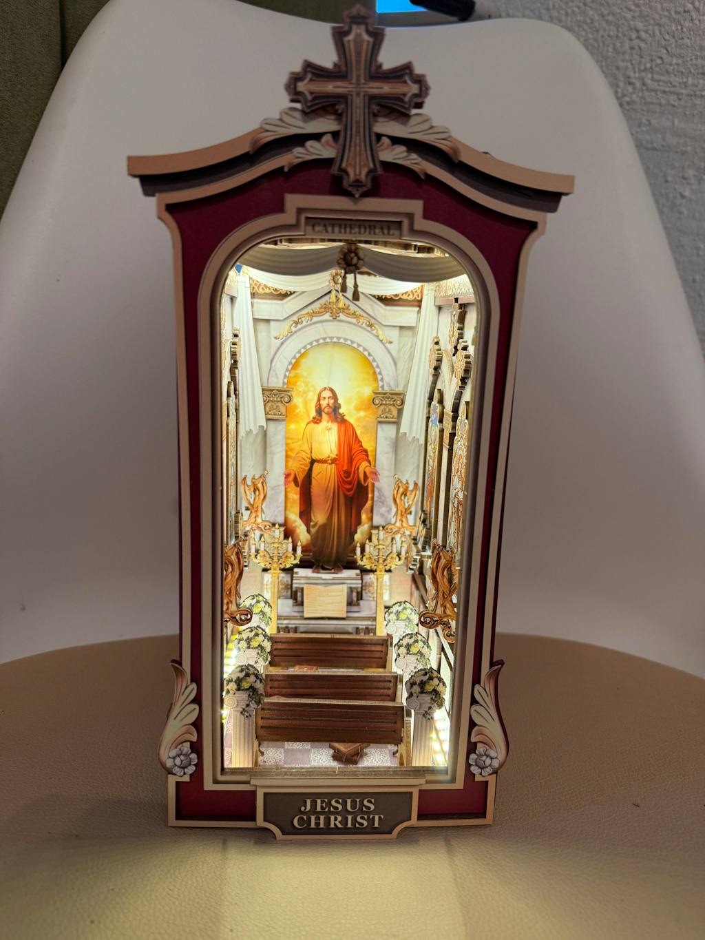 Imagina tener una iglesia en la estantería de tu biblioteca, iluminada con la calidez de un templo de fe y paz, realzando cada sutil detalle y transportándote a un mundo espiritual.