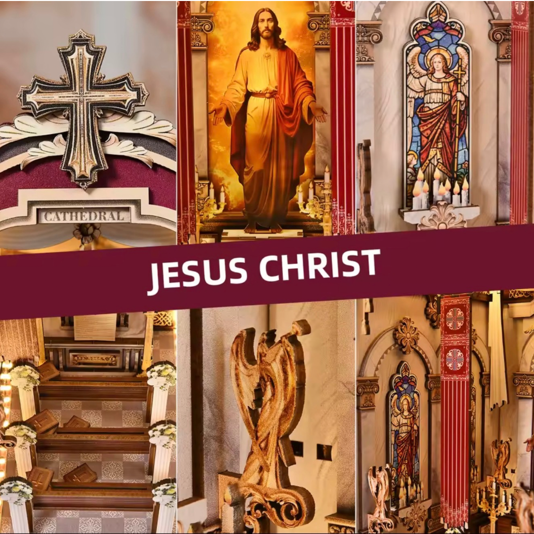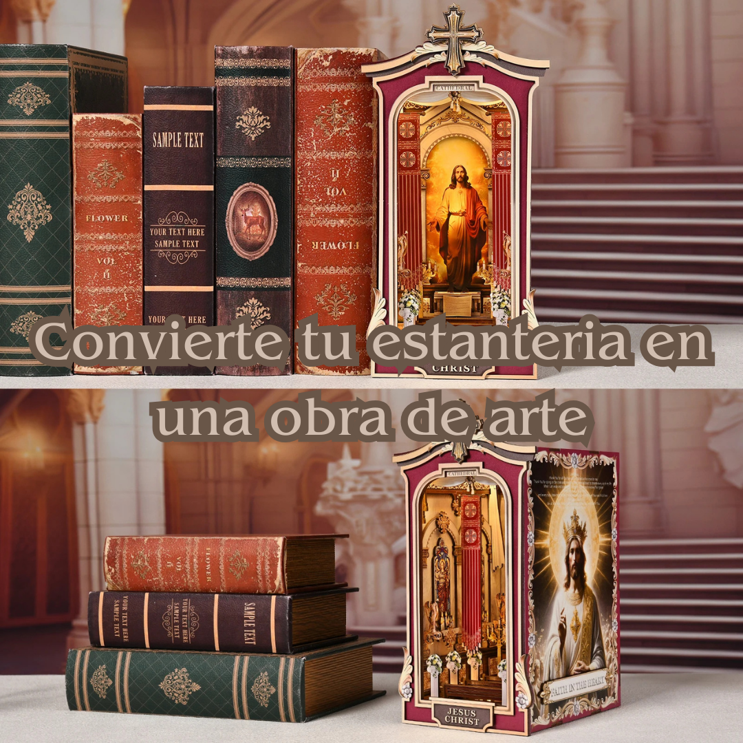 Nuestro book nook de Catedral de Luz es una pieza de arte espiritual en miniatura diseñada para crear un rincón de calma, fe y belleza en tu hogar.
